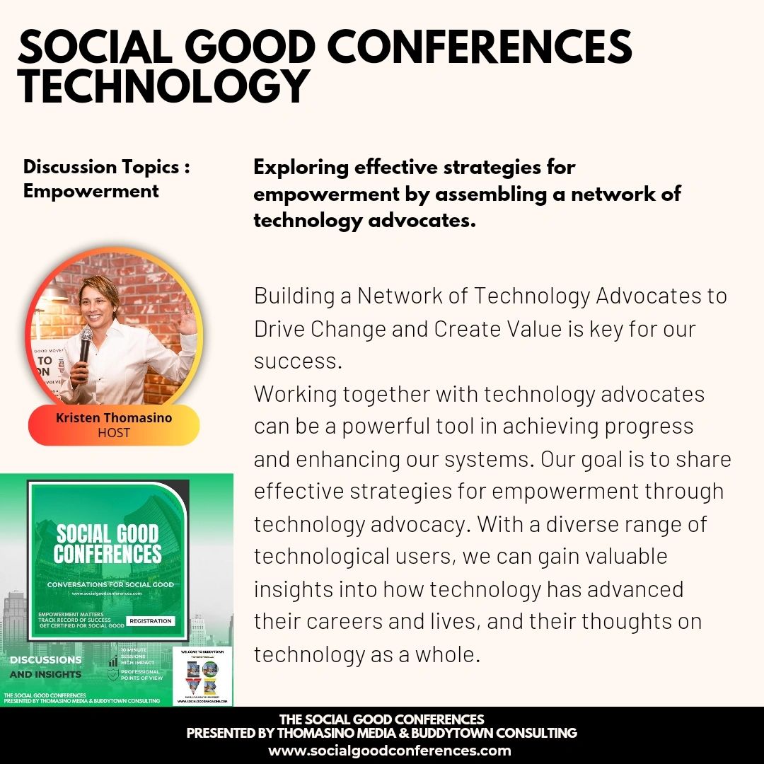 The Social Good Technology Conference gathers experts, leaders, and activists from different fields who aim to discuss and promote positive change in society. The conference emphasizes topics such as use in modern society, AI Automated Intelligence, hardware sourcing considerations, social media ethics, financial reform, and supply chain improvement.